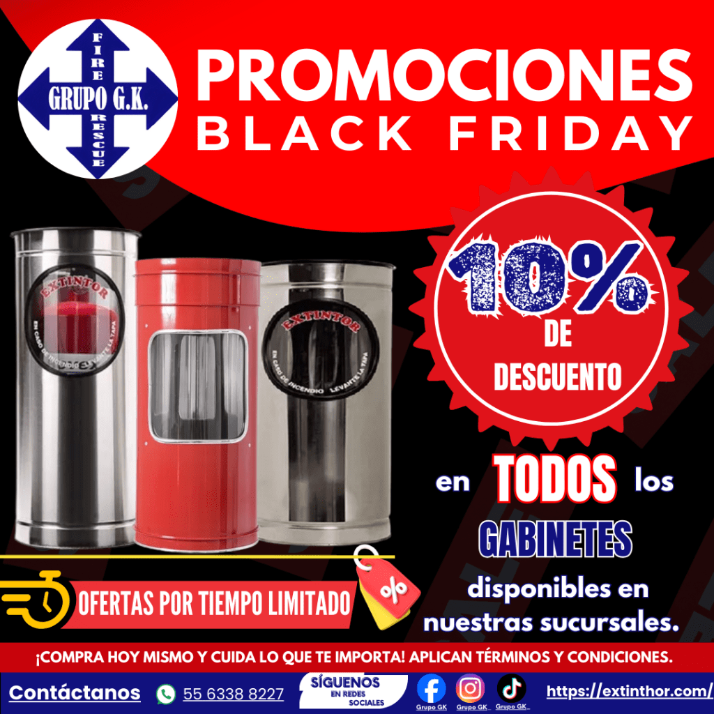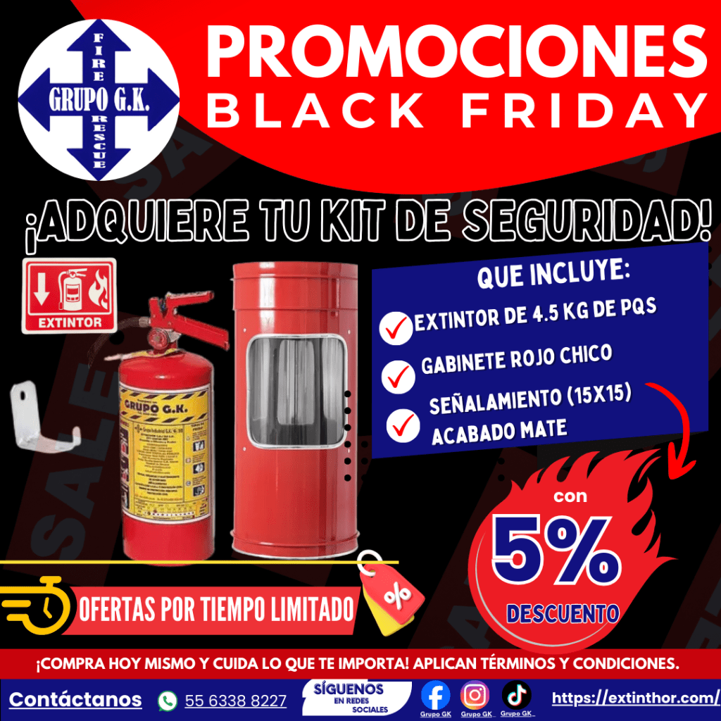 PROMOCION 4: Kit completo de seguridad que incluye un Extintor de 4.5 kg de PQS, un Gabinete rojo chico y un Señalamiento (15×15) acabado mate con un descuento del 5% por un precio total de $1,297, CON UN 5% DE DESCUENTO AL FINAL DE LA COMPRA. QUEDANDO EN $1235.