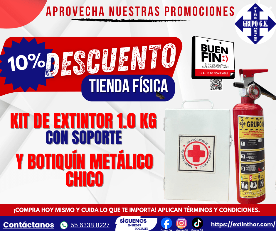 PROMOCIÓN 8: 10% de descuento en tienda física de Kit de Extintor 1.0 kg (con soporte) y Botiquín chico.