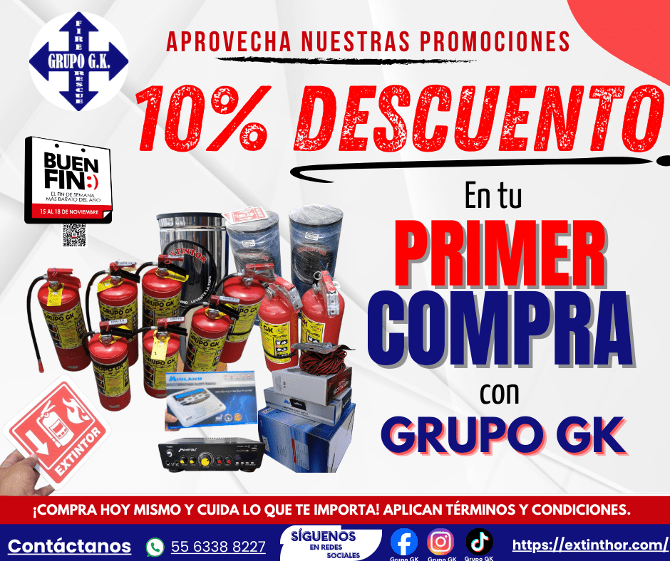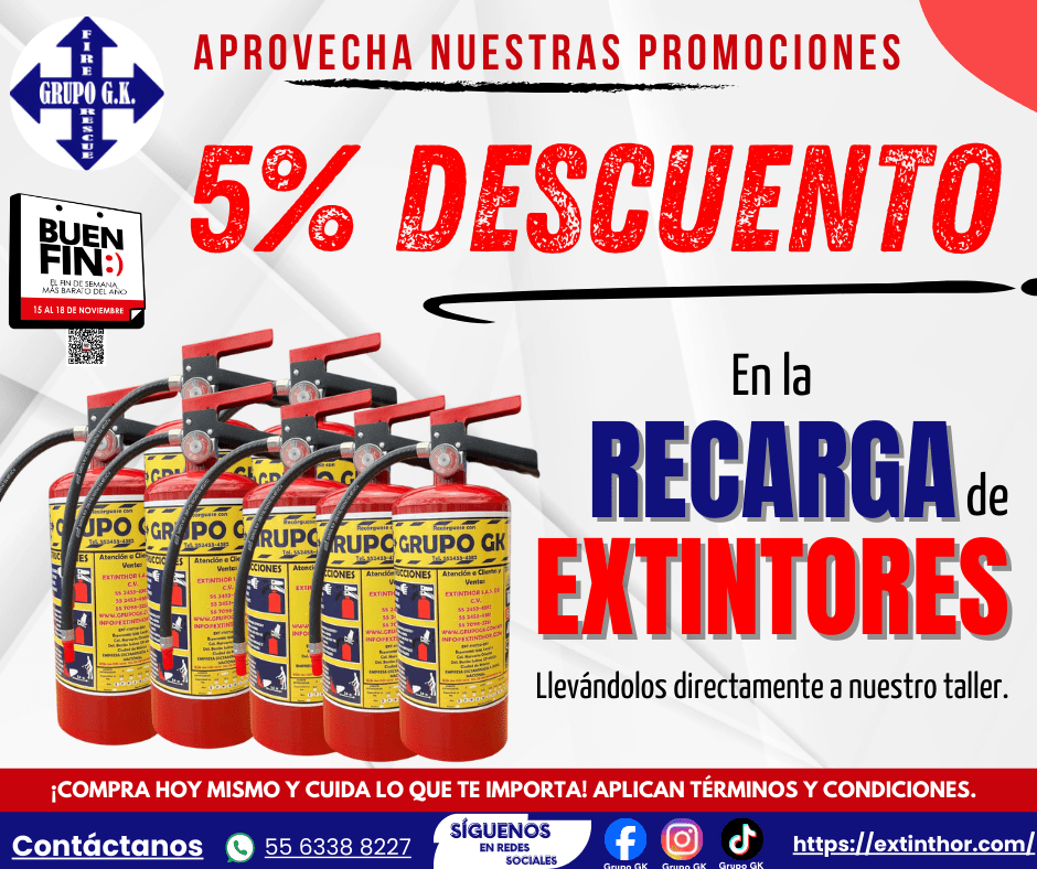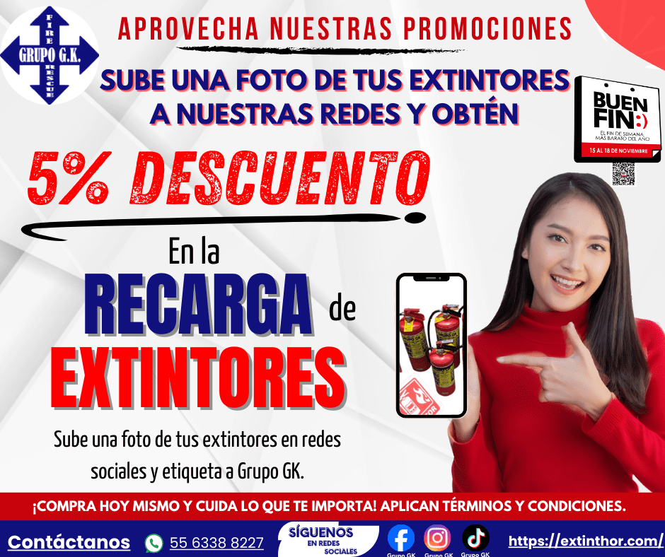 - Validez de la promoción: La promoción es válida exclusivamente durante el Buen Fin y solo para clientes que cumplan con los requisitos de la publicación en redes. La etiqueta de los extintores debe aparecer de frente, únicamente deben aparecer extintores de Grupo GK, se debe subir a las redes sociales y etiquetarnos en Facebook o Instagram (@Grupo GK), Grupo GK debe reaccionar a la foto para hacer válida la promoción y se deberá presentar la publicación al momento de solicitar su recarga junto con la nota de servicio correspondiente.