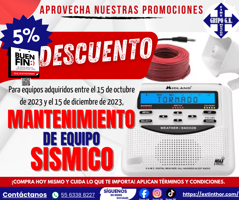 - Límite de la promoción: El 5% de descuento en el mantenimiento aplica únicamente a equipos de alertamiento sísmico adquiridos entre el 15 de octubre de 2023 y el 15 de diciembre de 2023. Esta promoción es válida una sola vez por cliente o razón social. Si son varios equipos, el descuento se aplica sobre el total de la compra. Valido solo llevando el equipo a nuestra sucursal de Esperanza 1045, Narvarte Oriente.