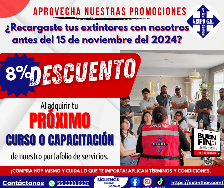 - Límite de la promoción: Esta promoción es válida una sola vez por empresa o razón social que haya recargado extintores del 1 de enero del 2024 al 15 de noviembre de 2024. El descuento del 8% aplica exclusivamente en la compra de un curso o capacitación de nuestro portafolio de servicios y está limitado a un curso de máximo 20 personas y presentando su nota de servicio. El descuento se aplica sobre el total de la compra.